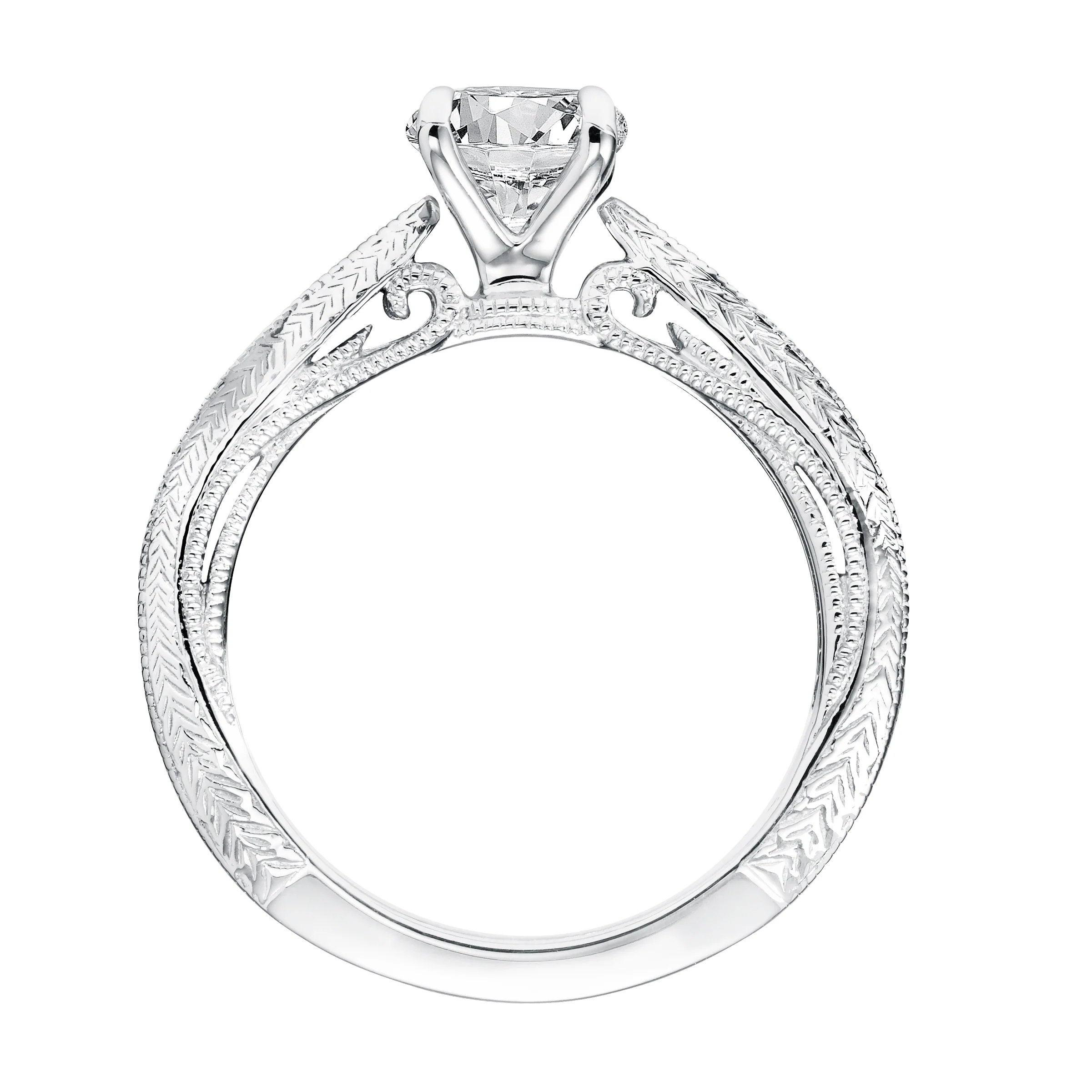 Diamond Prong Set Engagement Ring with Pinched Engraved Diamond Shank and Milgrain Detail Center stone not included.